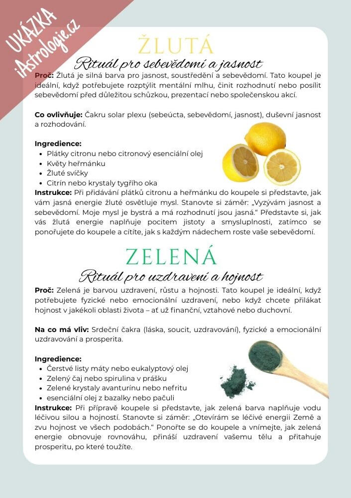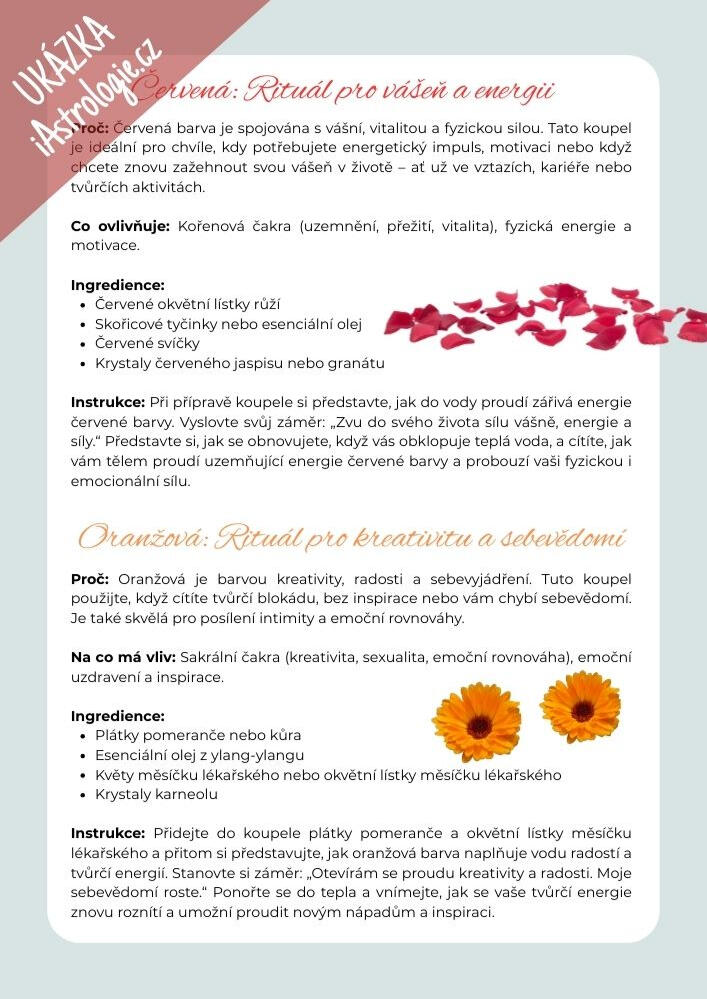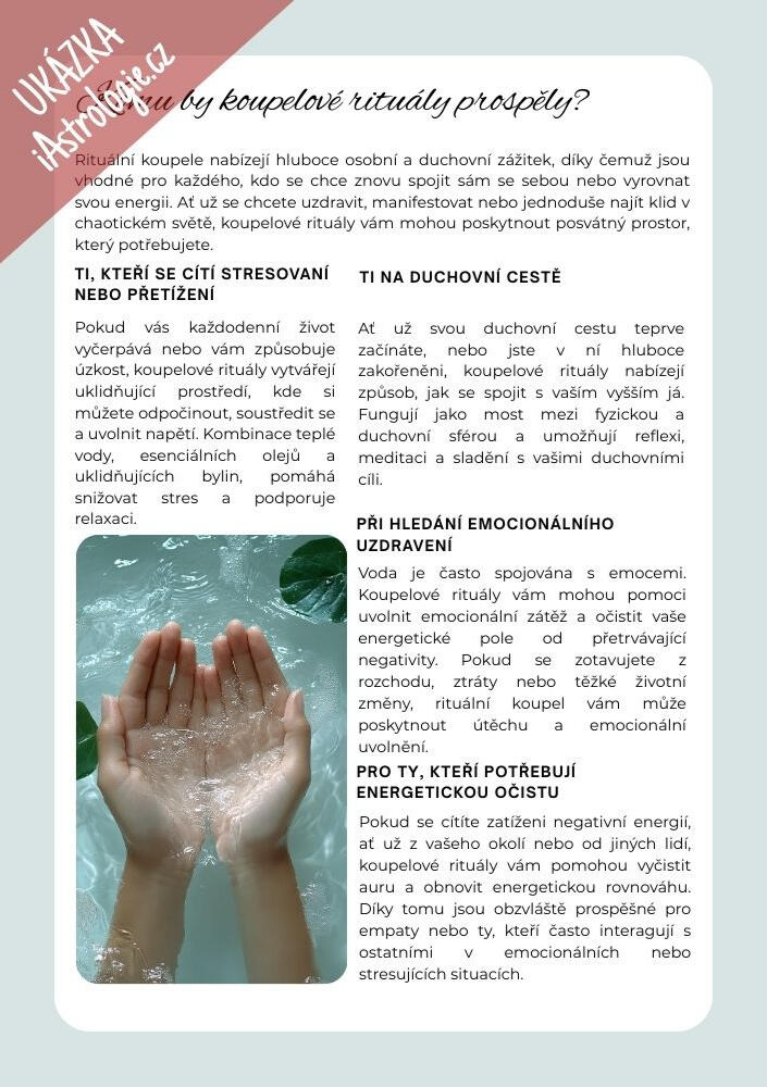 Jaké ingredience přidat, kdy koupel provádět, jak se na ni připravit?Voda má nejen relaxační, ale i očistnou a transformační schopnost.Podpořte sílu koupelí správně zvoleným rituálem, který umocní působení na vaše tělo i mysl.Napusťte vanu, připravte si ingredience, a nechte na sebe působit blahodárnou sílů vody!> Ihned u vás - doručení e-mailem