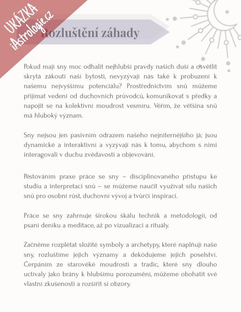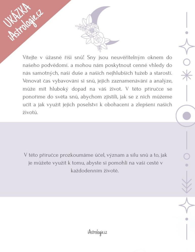 Odhalte skrytý význam snů!Sny nejsou pouze výplod vaší fantazie - odrážejí to, co se děje ve vašem podvědomí. Jejich správná interpretace a pochopení vám může pomoci na cestě životem.Naučte se, jak číst vaše sny, jak zvýšit schopnost jejich zapamatování a začněte si psát Deník snů, který se stane základem pro pochopení toho, co se ve vaší mysli odehrává.> Ihned u vás - doručení e-mailem